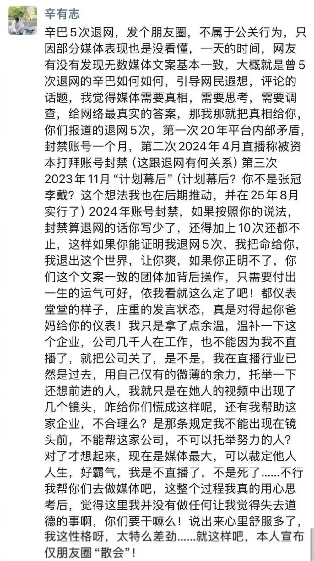 辛巴表示,他并非退网五次,所谓的“五次退网”,其中有3次是账号被封禁,有一次是在直播中表示“计划退居幕后”,“如果封禁算退网的话,你写少了,还得加上10次都不止,这样如果你能证明我退网5次,我把命给你”。而他在2023年11月曾在直播中表示计划退居幕后,最终在2025年8月实施了这一想法。