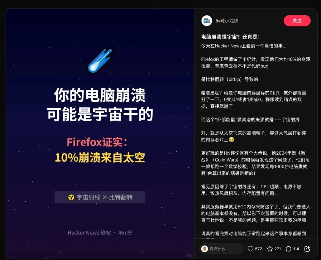 帖子里网友提到,火狐浏览器崩溃报错的原因中,有 10% 是宇宙射线的锅。