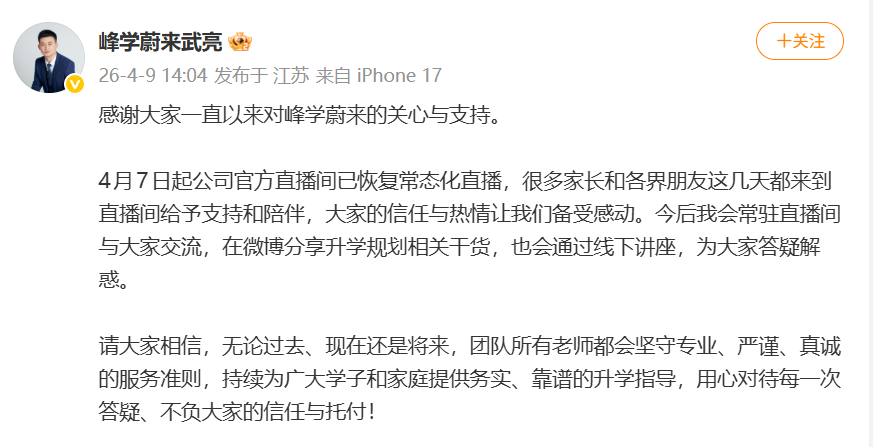 张雪峰接棒者武亮发文回应复播 官方直播间恢复常态化直播