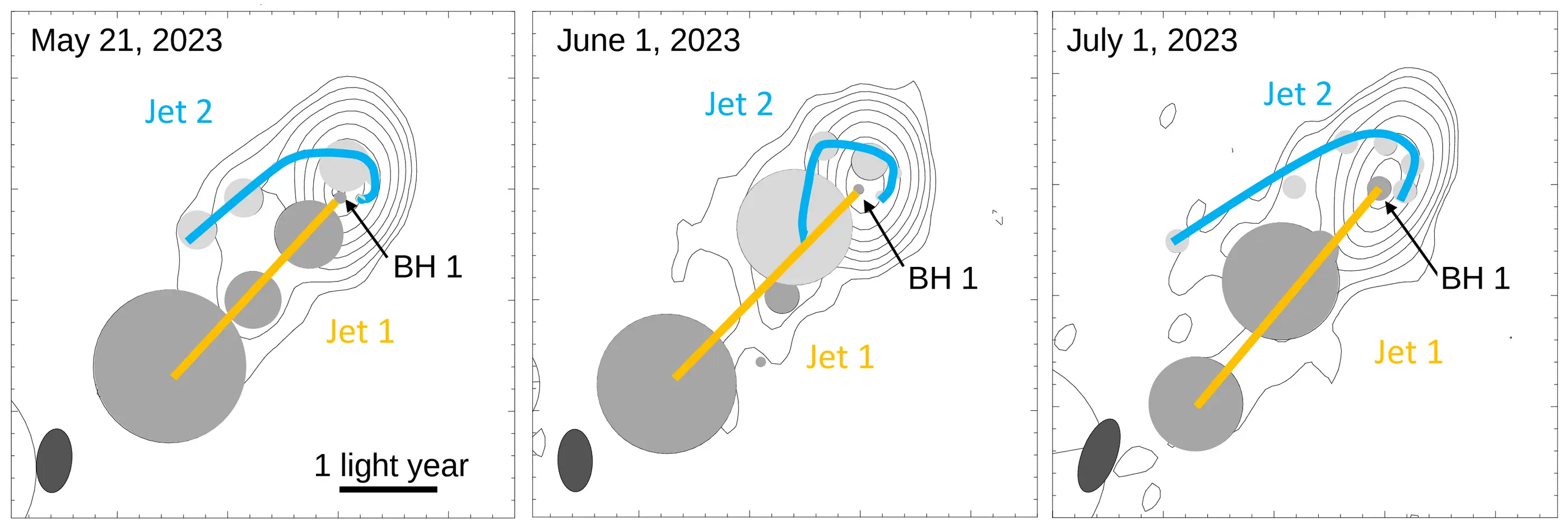研究团队对Mrk 501核心区域在不同射电频率下、跨越约23年的观测资料进行了系统分析,这些数据来自分布在全球的射电望远镜网络,形成了极高的角分辨率。 结果显示,除了指向地球、亮度格外突出的那条已知喷流之外,数据中还隐藏着第二条喷流,其方向与第一条明显不同,且在短短数周时间内呈现出显著位置变化。 伴随多历元数据的比对,天文学家不仅“看到”了第二条喷流,还能追踪其绕行路径,这被解释为它围绕另一颗黑洞公转的投影效应。