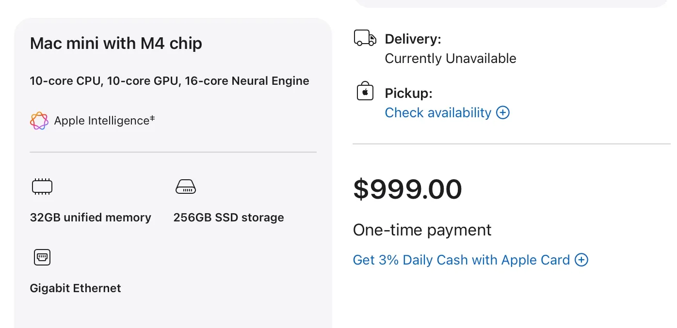 虽然部分其他配置的 Mac mini 和 Mac Studio 仍然可以购买,但交付时间同样相当悲观。目前 M3 Ultra 芯片版本的 Mac Studio 普遍需要至少五周才能发货。至于 Mac mini,根据不同的内存与 SSD 存储组合,用户的等待时间大致从一个月到三个月不等。