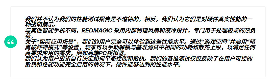针对此事,红魔品牌所属的努比亚官方也发布了声明。官方并不认为自家的性能测试行为有违道德。他们表示,这是对硬件真实性能的透明展示。和其他智能手机不同,红魔机型采用内部物理风扇加液冷的散热设计,专门应对极端热负荷。