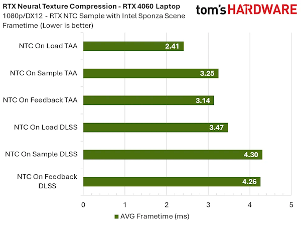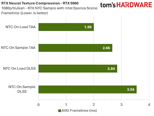 测试团队同时明确,测试场景仅包含基础前向渲染与抗锯齿流程,实际3A游戏有大量不受NTC影响的渲染通道,因此这项技术在实际游戏中的相对性能损耗,会比测试数据更低。