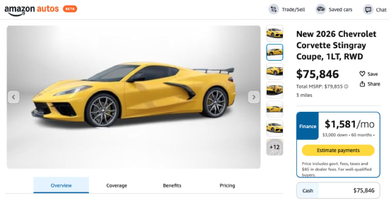 如今,你可以在亚马逊网站上直接购买全新科尔维特跑车。过去一年半,这家电商巨头悄然扩张了汽车销售业务。该项目最初仅与现代汽车合作试水,近几个月已陆续接入起亚、马自达、斯巴鲁、雪佛兰和 Jeep 等品牌车型。亚马逊表示,这项名为亚马逊汽车(Amazon Autos)的服务已覆盖洛杉矶、达拉斯、纽约等超 130 座城市。