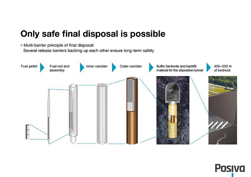 整个处置场建在地下430米深处。隧道全部开凿在距今19亿年的基岩中。这片基岩地质稳定性极强,地震风险极低。按照设计,使用过的核燃料棒,会先在地面封装厂封入特制铜制容器。随后由无人机械设备送入地下处置隧道,容器固定在基岩钻孔中,外围再用吸水膨润土填充缓冲。