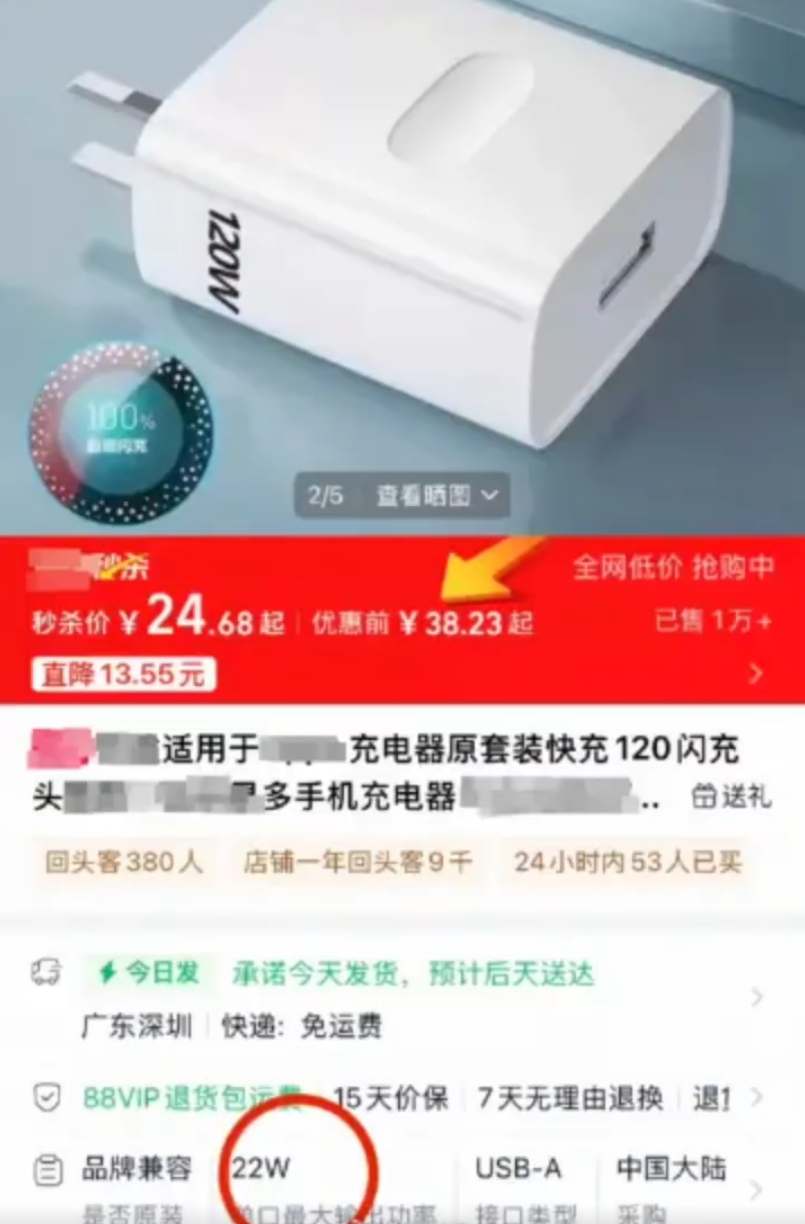 据悉,目前电商平台上大量标注“120W超级闪充”的充电器售价低廉,普遍低于50元。
