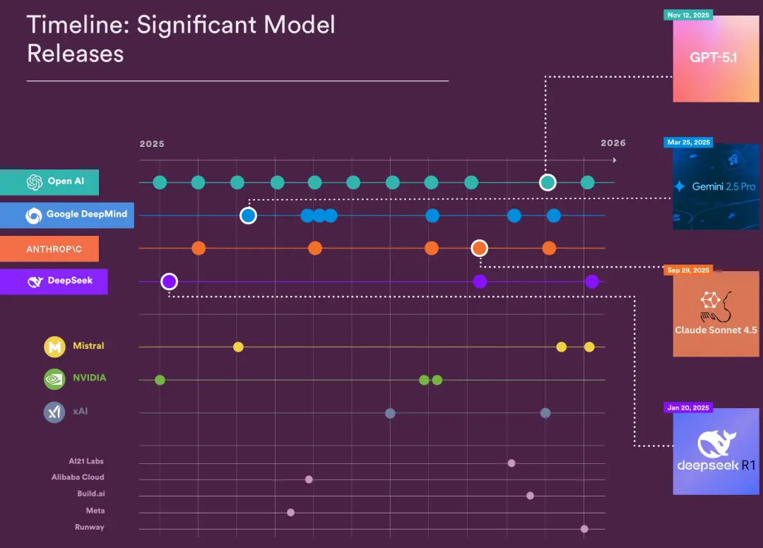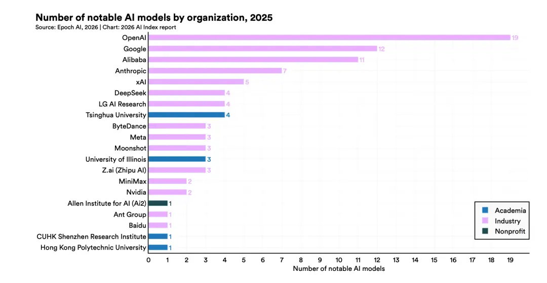 2025年美国发布了50个“显著模型”,中国紧跟着也发布了30个顶尖大模型。