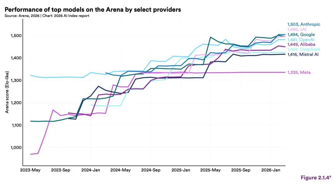 中美AI模型性能差距已基本消失,双方在巅峰对决中频繁易主,目前Anthropic领先优势仅剩2.7%。