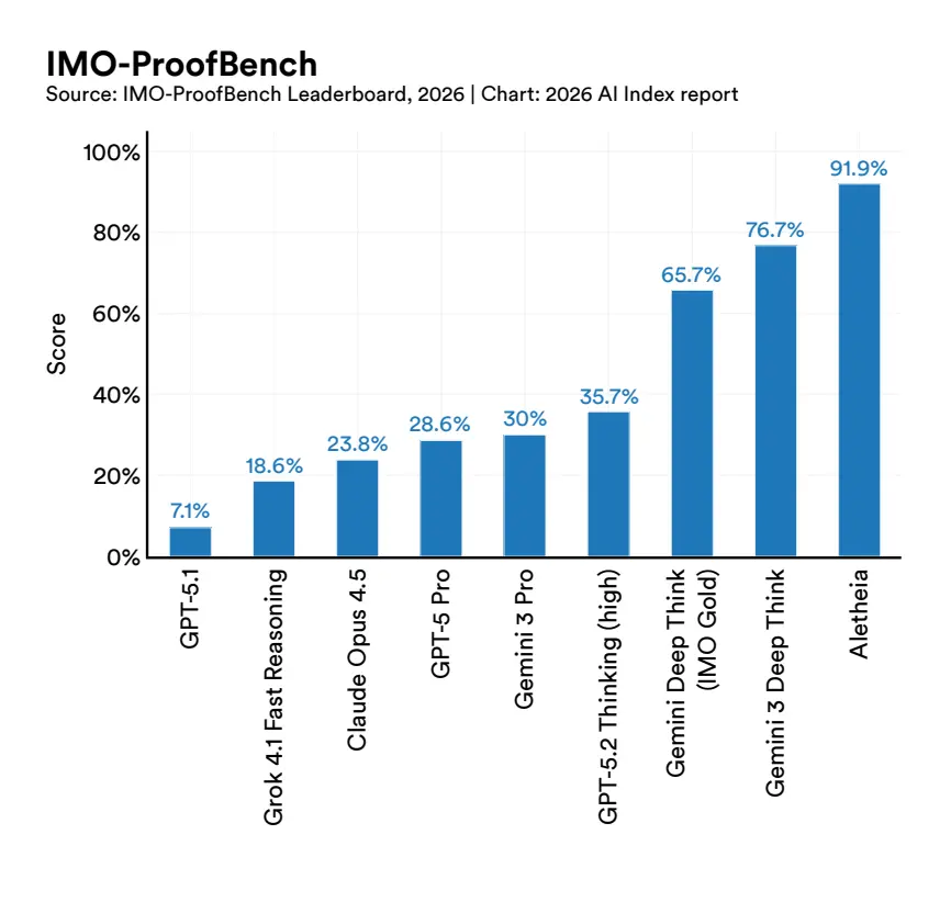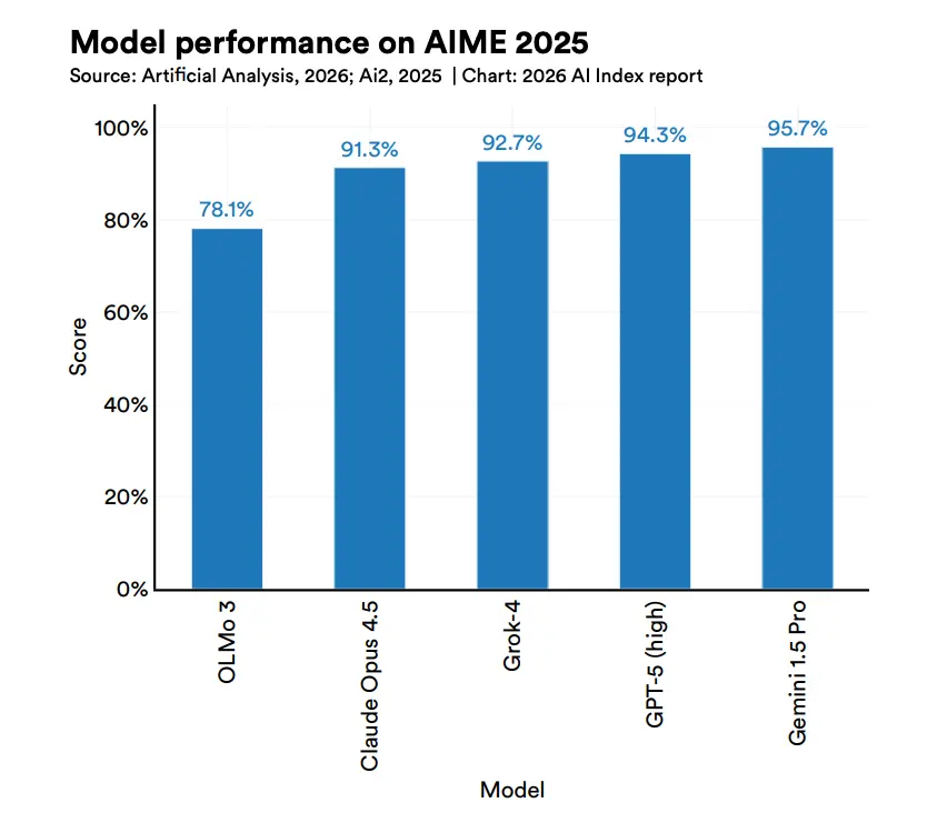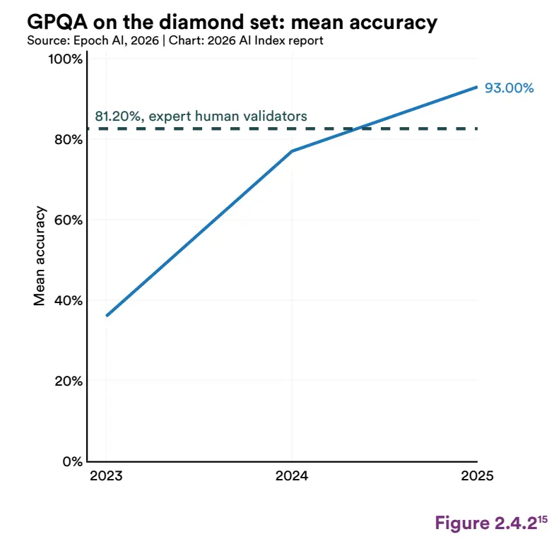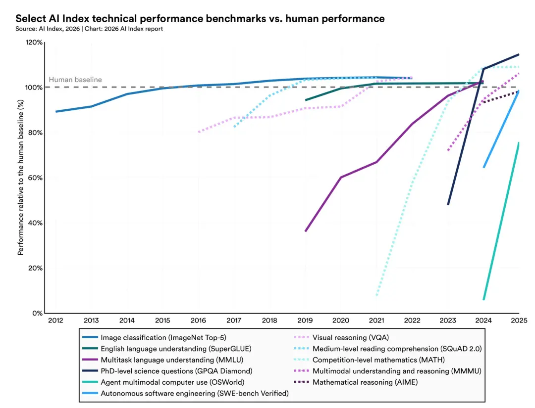 过去一年,全球超90%的顶尖模型,在博士级科学问题、多模态推理、竞赛数学上的表现,追平甚至超越了人类。
