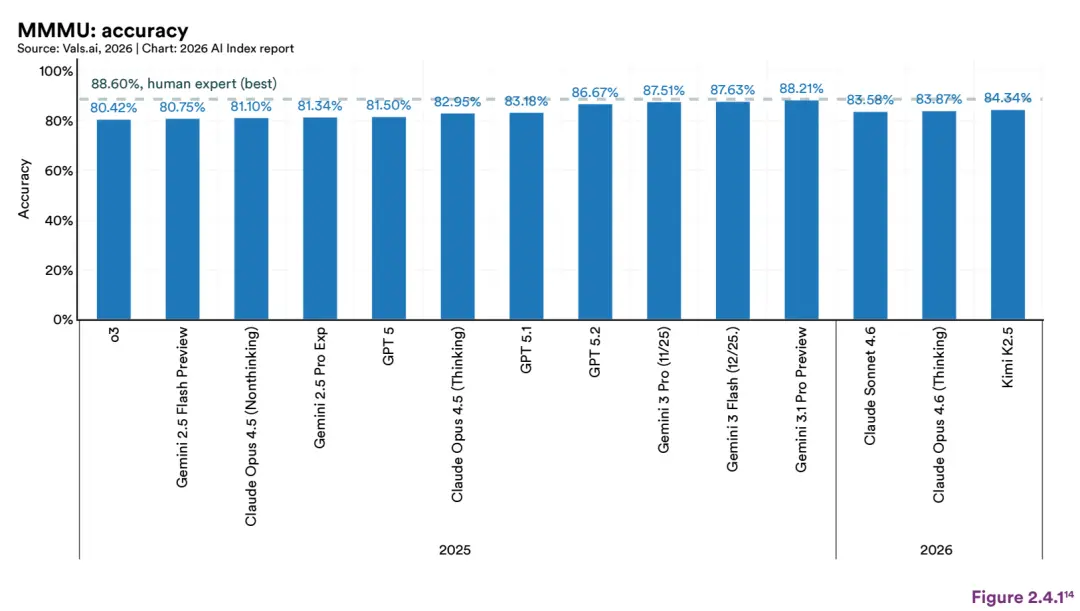 PhD级科学问答(GPQA Diamond)、竞赛数学(AIME)、多模态推理(MMMU)这些原本被认为“人类不可超越”的硬骨头,全部被前沿模型啃了下来。