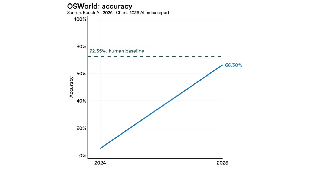 另外,在智能体任务中,OSWorld测试中,前沿AI实力(66.3%)正逼近人类基线。