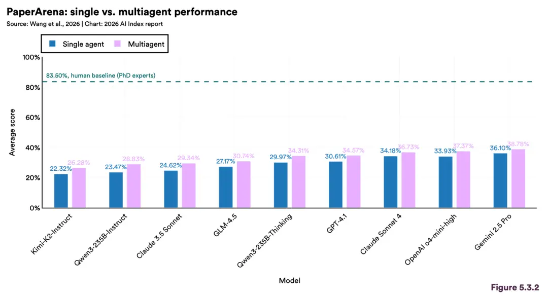 然而,在专门评估科研逻辑的PaperArena测试中,最强AI加持的Agent,得分仅39%,只有博士生一半的功力。