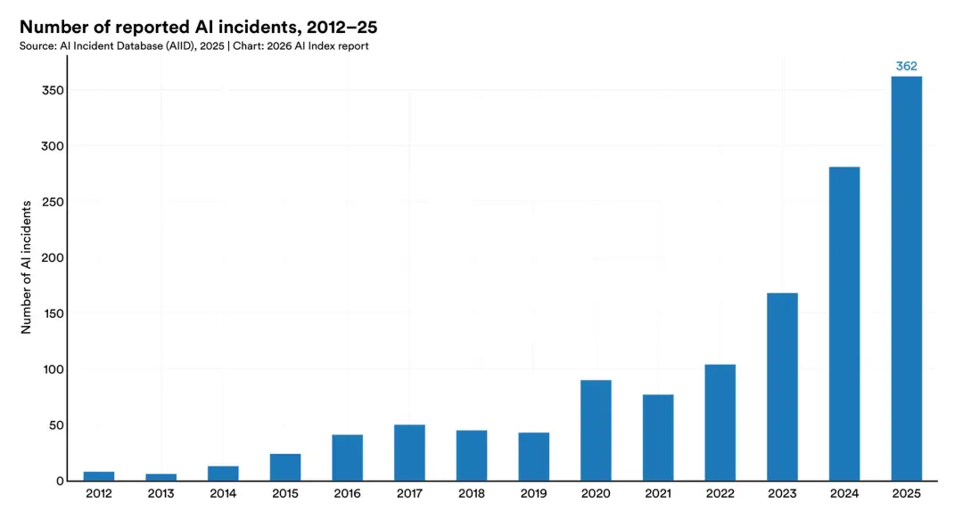 代价同步在涨。AI相关事故记录从2024年的233起涨到362起。