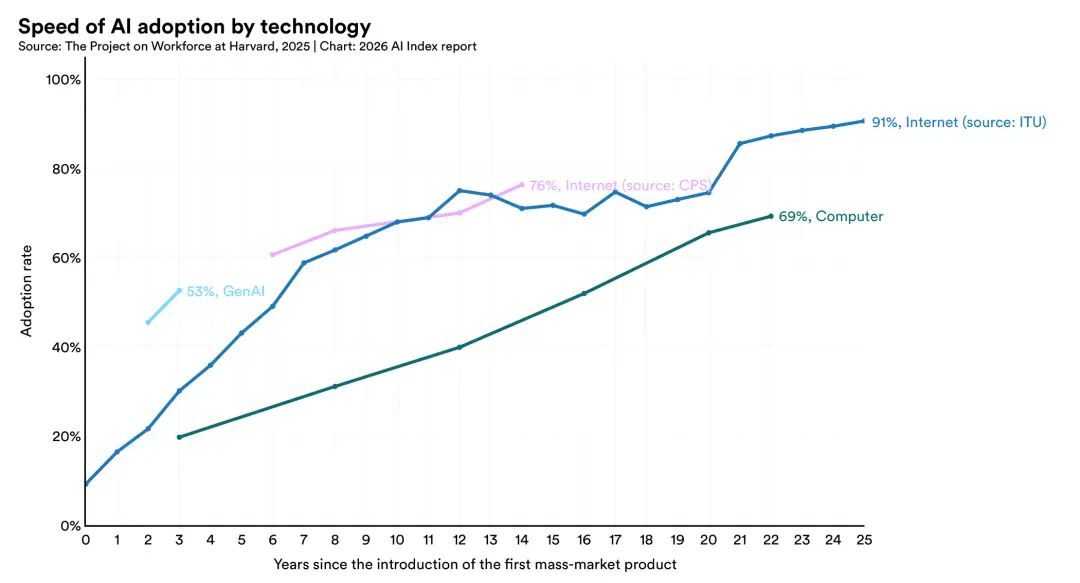 生成式AI在三年内达到了53%的全球人口渗透率。