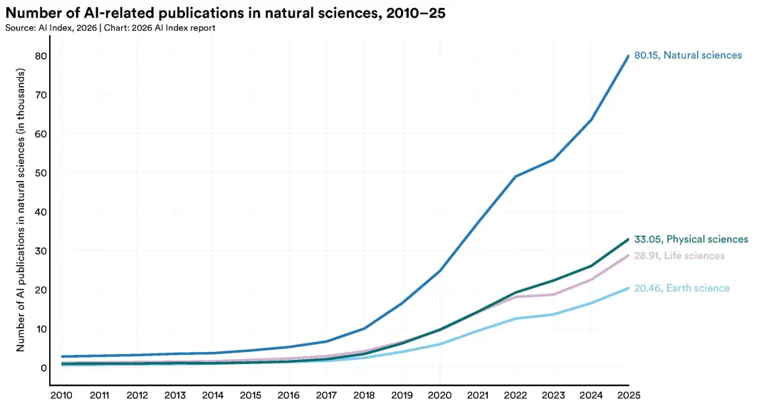 自然科学、物理科学、生命科学领域的AI相关论文,2025年同比增长了26%到28%。