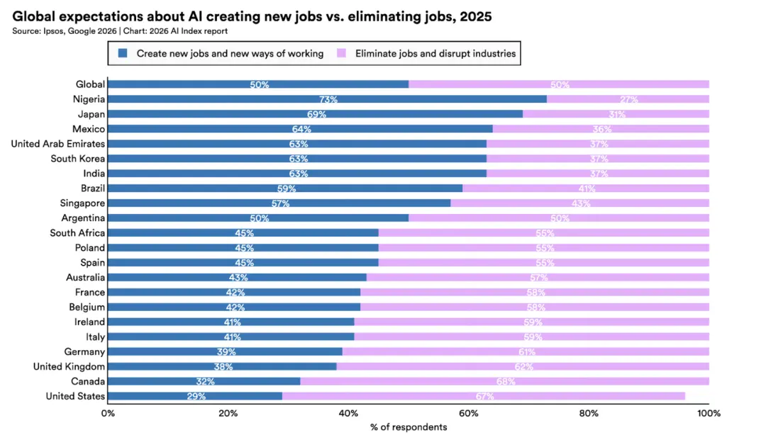 全球范围内,认为AI利大于弊的比例从52%上升到59%。但同期,对AI感到紧张的比例从50%上升到52%。