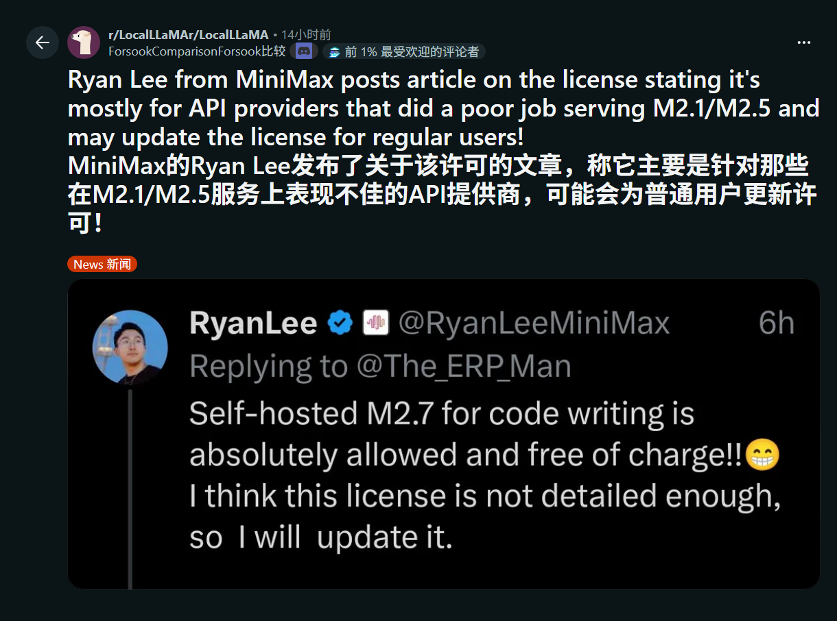 简单来说,他的解释认为之前的许可证是不禁止第三方商业用途的,但这出现了第三方平台胡作非为的可能,并导致用户体验不佳,而用户的不满则指向了MiniMax,会让人觉得是他们的模型质量不行。