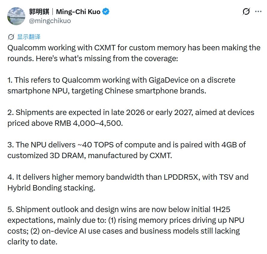 然而,尽管技术上有所突破,但该项目的市场预期却出现了一定程度的下调。郭明錤表示,由于内存价格大幅上涨推高了NPU的整体成本,合作产品的出货预期低于最初设想。