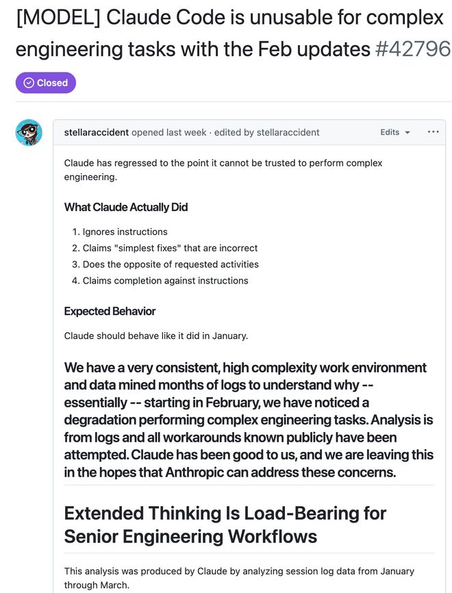 最强的编程AI,到底降没降智?今年2月初,Anthropic发布Claude Opus 4.6,其凭借着深邃的推理逻辑和对复杂代码规范的精准执行,被业界奉为代码真神。然而好景不长,发布仅数周后就不断有用户在社交媒体上声讨,称其性能出现了断崖式下跌。