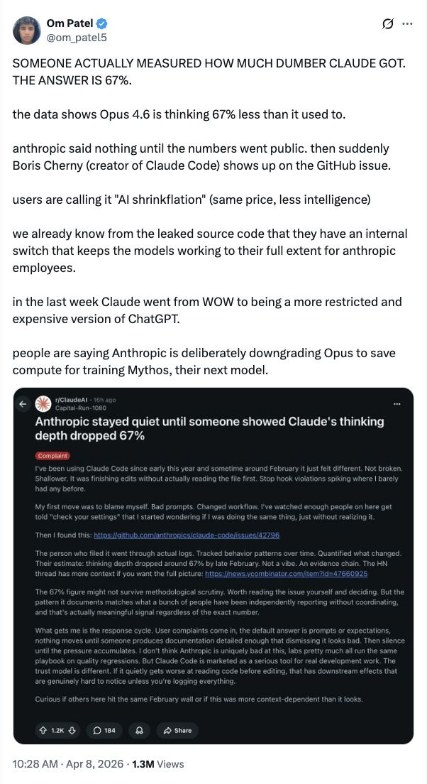 网红开发者奥姆·帕特尔(Om Patel)直接在X上贴出了结论,有人测出了Claude变笨了多少,答案是67%。