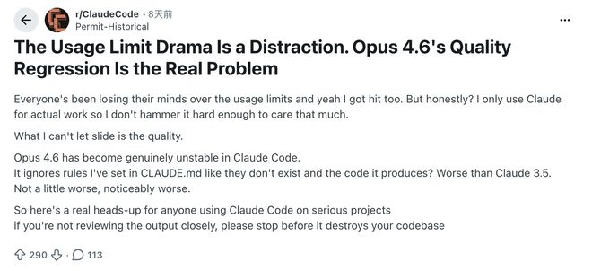 不少用户声称自己付着同样高昂的月费,换来的却是一个被明显降智的缩水版本,Opus 4.6开始变得懒惰与健忘,甚至在基础逻辑里反复撞墙。