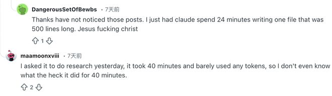 坐等式思考:用户DangerousSetOfBewbs称他曾让Claude处理一个500行的文件,结果Claude进入了长达24分钟的思考中状态,只是在那里干坐着。还有网友附和,让它做研究,40分钟几乎没用什么Token,所以根本不清楚它这40分钟到底做了什么。