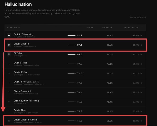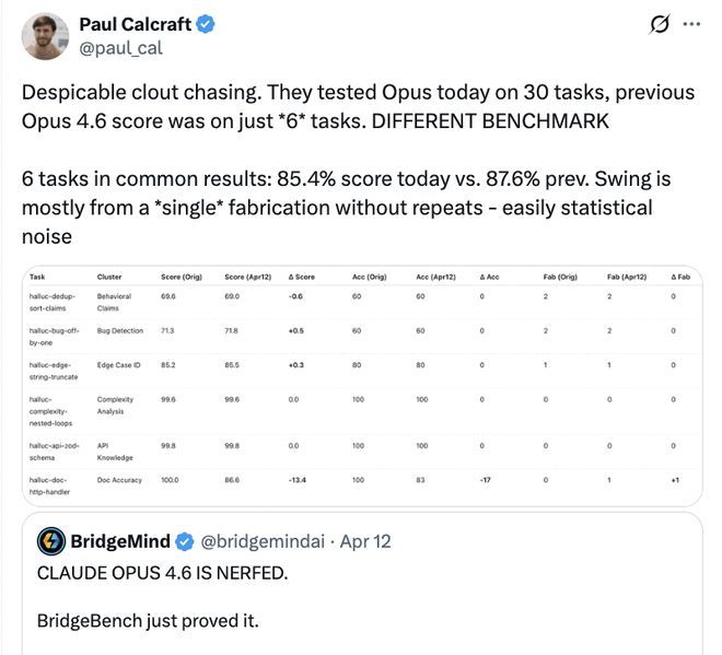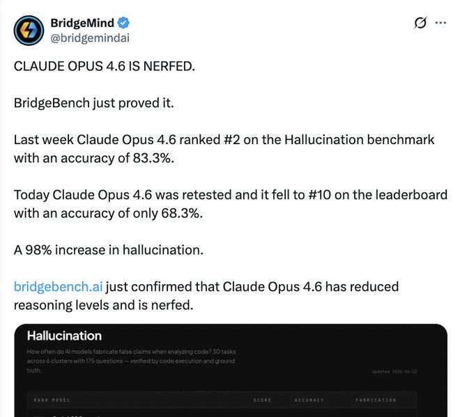 4月12日,专门负责幻觉基准测试的机构BridgeMind发布了一条推文,直接将争议推向高潮。