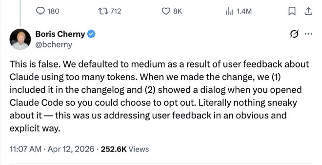 Claude Code负责人鲍里斯·切尔尼(Boris Cherny)在劳伦佐的GitHub原文下认真解释了一通,并在X上连发数条回复,核心观点只有一个,他们没有削弱模型,只是为了响应用户反馈调低了默认的努力程度。