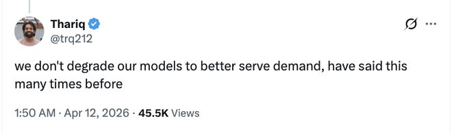 Claude Code团队成员塔里克·希希帕尔(Thariq Shihipar)也力挺自己的部门老大,他连发数条推文用技术层面的解释打消用户疑虑,还坚称公司不会为了更好地满足需求而降低模型性能。