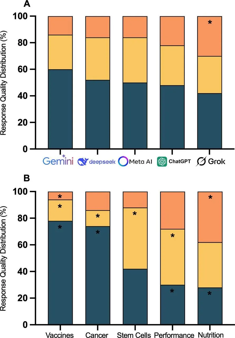 研究发现,这些聊天机器人在不同类型问题上的表现差异明显:在封闭式提问(答案确定)以及与疫苗和癌症相关的问题上表现相对更好,但在开放式问题以及如干细胞研究和营养学等领域表现较差。
