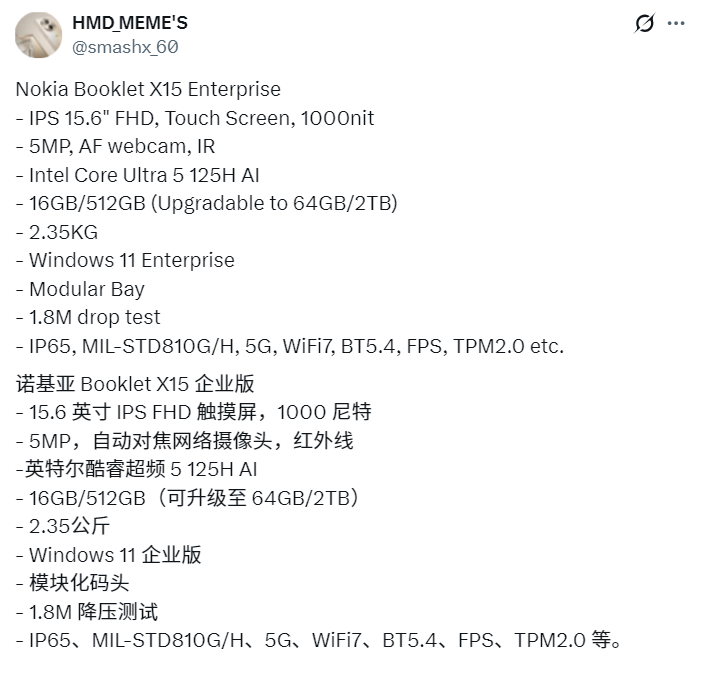 继曝光诺基亚Mission-Safe Phone 2三防手机后,smashx_60又披露了诺基亚Booklet X15 Enterprise三防笔记本的首张渲染图和详细规格。这款产品将面向工业客户,主打极端环境下的可靠使用。