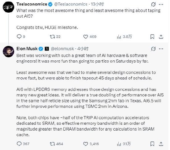 马斯克称AI5提前45天完成流片 AI6性能将翻倍