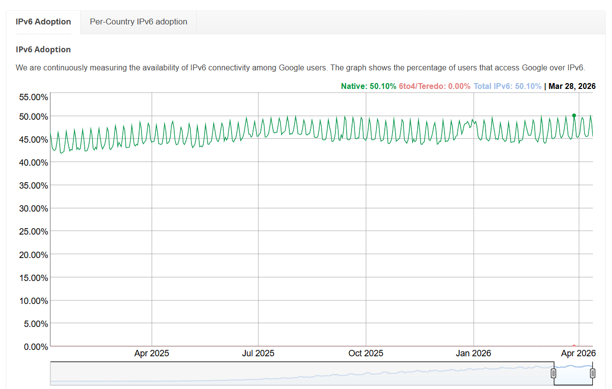 Google流量监测数据显示,在3月28日的时候,全球通过IPv6连接访问Google服务的用户比例首次触及50%,标志着这一诞生于1998年的协议在历经28年后终于迎来历史性里程碑。APNIC统计显示全球IPv6使用率为43%,Cloudflare数据显示实际传输流量中IPv6占比达40%,考虑到Cloudflare统计的是实际传输数据包而非简单计数,这一数字的含金量更高。