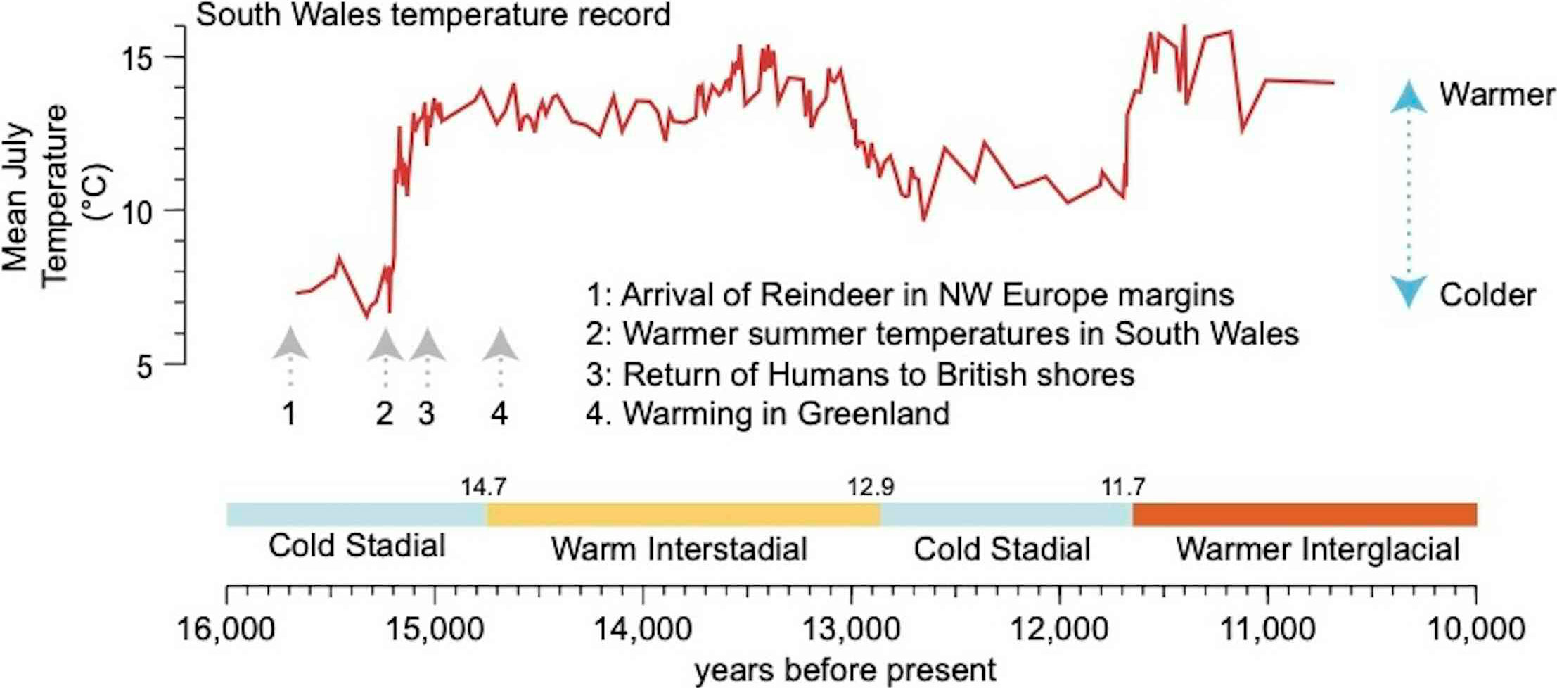 在最后一块覆盖北半球大片地区的冰盖退缩后,人与动物向北迁徙的进程长期被认为与一次主要的暖期紧密同步。 传统年代框架下,学界普遍认为西北欧在大约14700年前自冰期状态快速转暖,人类也在那时重新占据如今的不列颠地区。 然而,随着放射性碳测年技术的改进,早在本世纪初,研究人员就注意到,一些人类遗骸和相关遗物给出的年代明显早于这一暖期,这与当时普遍接受的“气候太冷不适宜人类生存”的图景出现了明显矛盾。
