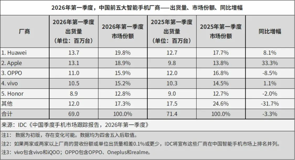 最近,打算换手机的人可能发现:手机变贵了。这不只是因为厂商“想多赚一点”,而是存储涨价带来的成本压力,直接把市场座次搅乱了。4月中旬,Omdia和IDC先后发布了2026年第一季度中国智能手机市场报告:华为稳居第一,苹果第二,OPPO和vivo分列三四名。
