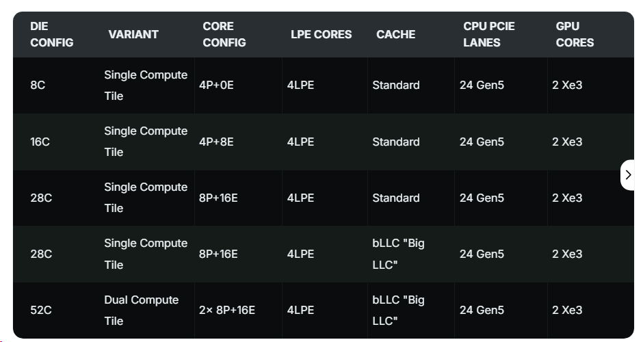 芯片配置方面覆盖6核到52核,入门级为8核配置(4P+4LPE),随后是16核(4P+8E+4LPE),中端为两款28核配置(8P+16E+4LPE),其中一款为标准版,另一款搭载bLLC大缓存,单芯片缓存达144MB