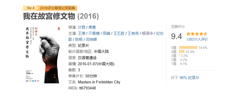 《我在故宫修文物》于2016年1月首播,目前在豆瓣的评分高达9.4分,是2016评分最高纪录剧集。