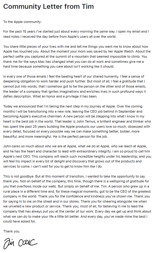 这不是告别。在这个交接的时刻,我想亲口向大家道一声感谢。这次,并非代表公司致谢 —— 苹果全体同仁心中早已盛满对各位用户的感激。这一次,仅代表我自己,蒂姆。一个出身于偏远小镇、生在普通年代的普通人,有幸在这段珍贵的时光里,执掌这家全球最伟大的企业。