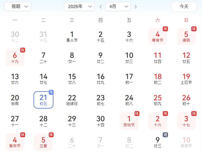 依据国务院办公厅《关于2026年部分节假日安排的通知》:劳动节,5月1日(周五)至5日(周二)放假调休,共5天,5月9日(周六)上班。按当前日期计算,再上7天班即可开启假期,节后5月9日(周六)上班补班,整体节奏“5天连休、仅补1天”。