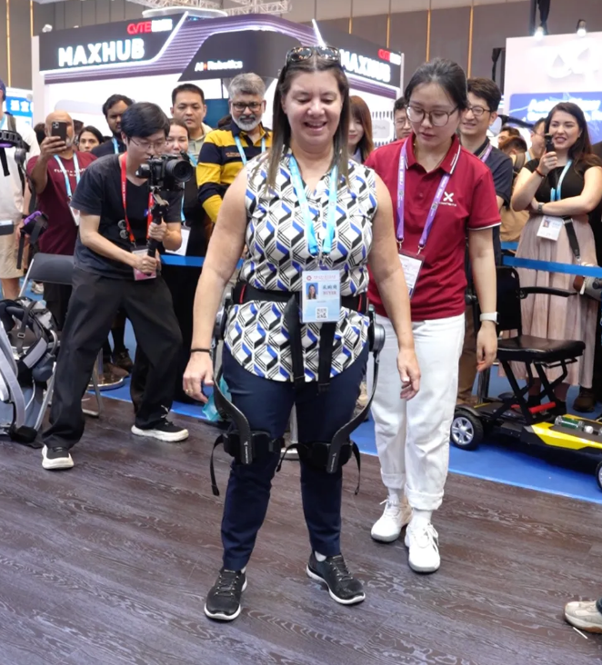 半小时后,在同伴与工作人员的搀扶下,她艰难起身,穿戴好外骨骼设备。这位已失去正常行走能力的女士,在设备的辅助下重新“站”了起来,并缓缓迈出了几步。