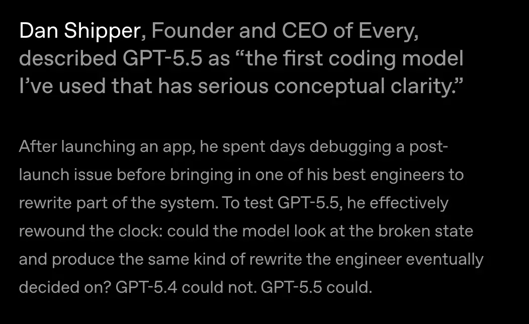这次奥特曼没有自己站出来说“初体验被吓到眩晕瘫坐,那一刻就像看到原子弹爆炸”了,而是请了一群嘴替(早期测试用户)。其中有一位英伟达工程师,他在早期测试结束后短暂的失去了GPT-5.5的访问权限,然后说了这样一句话: