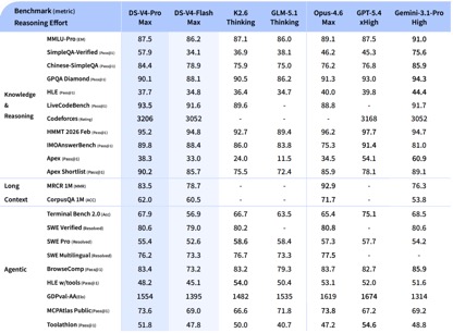 在数学、STEM、竞赛型代码的测评中,DeepSeek-V4-Pro 超越当前已公开评测的绝大多数开源模型,取得了比肩世界顶级闭源模型的成绩。