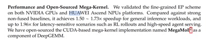 在官方开源的技术文档中,DeepSeek也提及了这一点,直言v4已在NVIDIA GPU和HUAWEI Ascend NPUs平台上验证了精细粒度的EP(专家并行)方案,相较于强大的非融合基线,其在通用推理任务上可实现1.50-1.73倍的加速效果,而在对时延敏感的场景(如RL推演和高速代理服务)中则可达到1.96倍的加速效果。