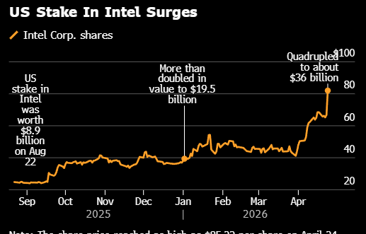 白宫此前宣布的协议令美国政府在特定条件以每股20.47美元的价格收购4.333亿股英特尔普通股。投资价值达89亿美元。政府直接持有超过2.7亿股,部分股份存放于托管账户中。上述账面估值假设政府行使协议项下的全部购买权。