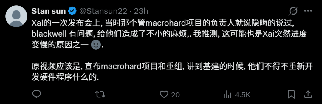xAI在一次发布会上,Macrohard项目的负责人曾隐晦提到,英伟达最新的芯片给他们造成了“不小的麻烦”,不得不重新开发硬件适配程序。这或许也解释了xAI进度突然放缓的原因之一。