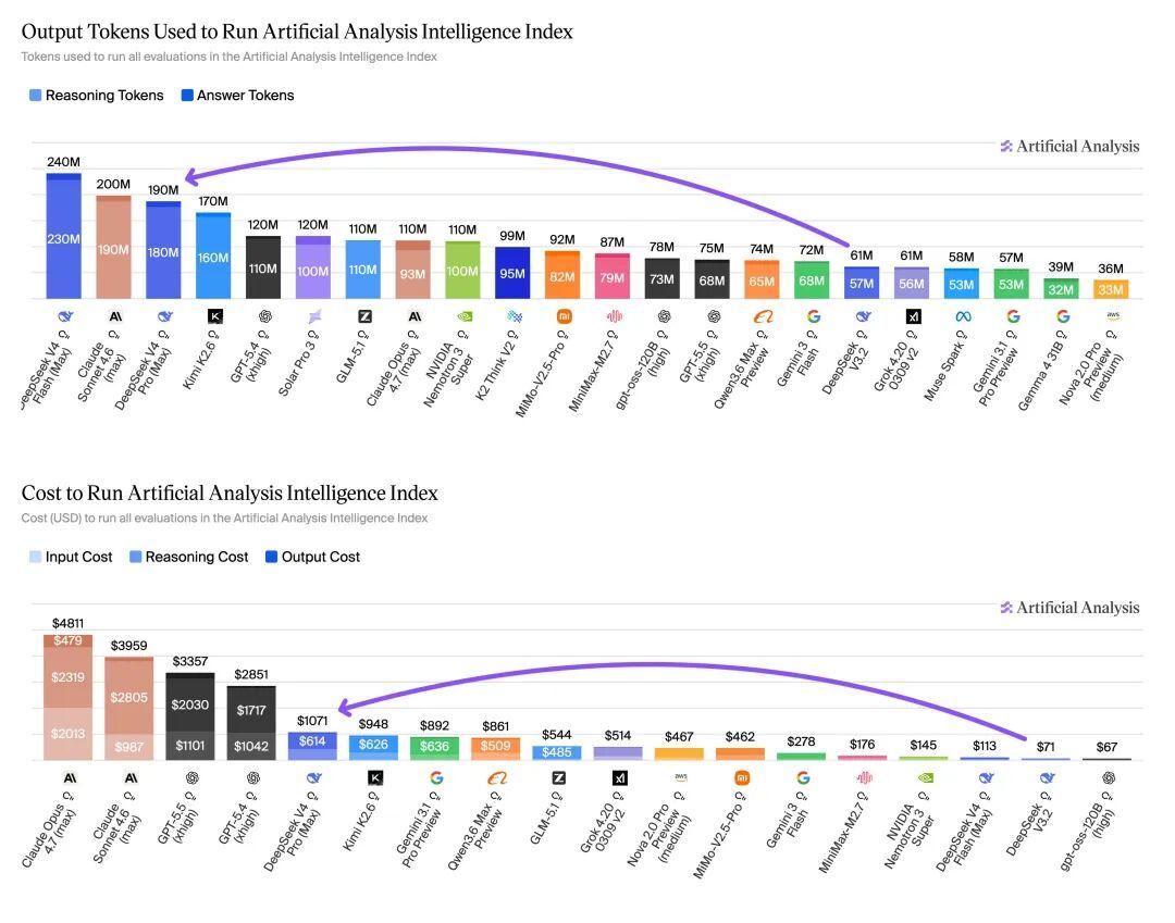 跑完Intelligence Index的全量基准测试,V4 Pro只花了1071美金,比Claude Opus 4.7的4811美金便宜了四倍多。