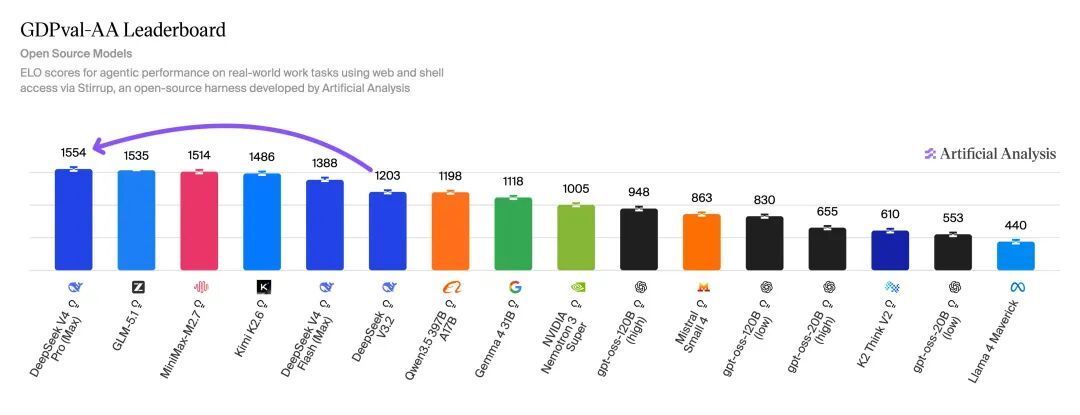 Agent能力方面,V4 Pro Max在GDPval-AA实测(面向真实工作任务的Agent基准)中拿到了1554分,全面领先一众开源模型。
