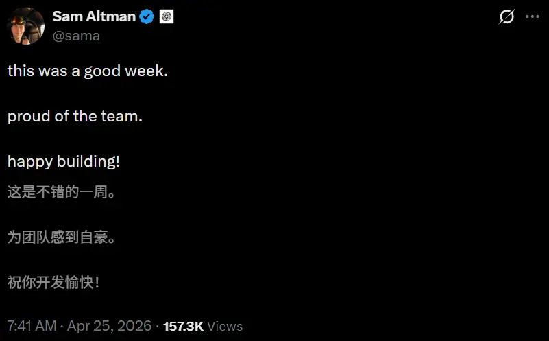 今天早上,心情大好的奥特曼发了条X,“这周过得不错,为团队感到骄傲,祝大家开发愉快!”