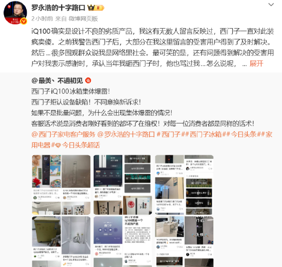 曝光西门子iQ100冰箱大批故障 罗永浩称是“劣质产品”