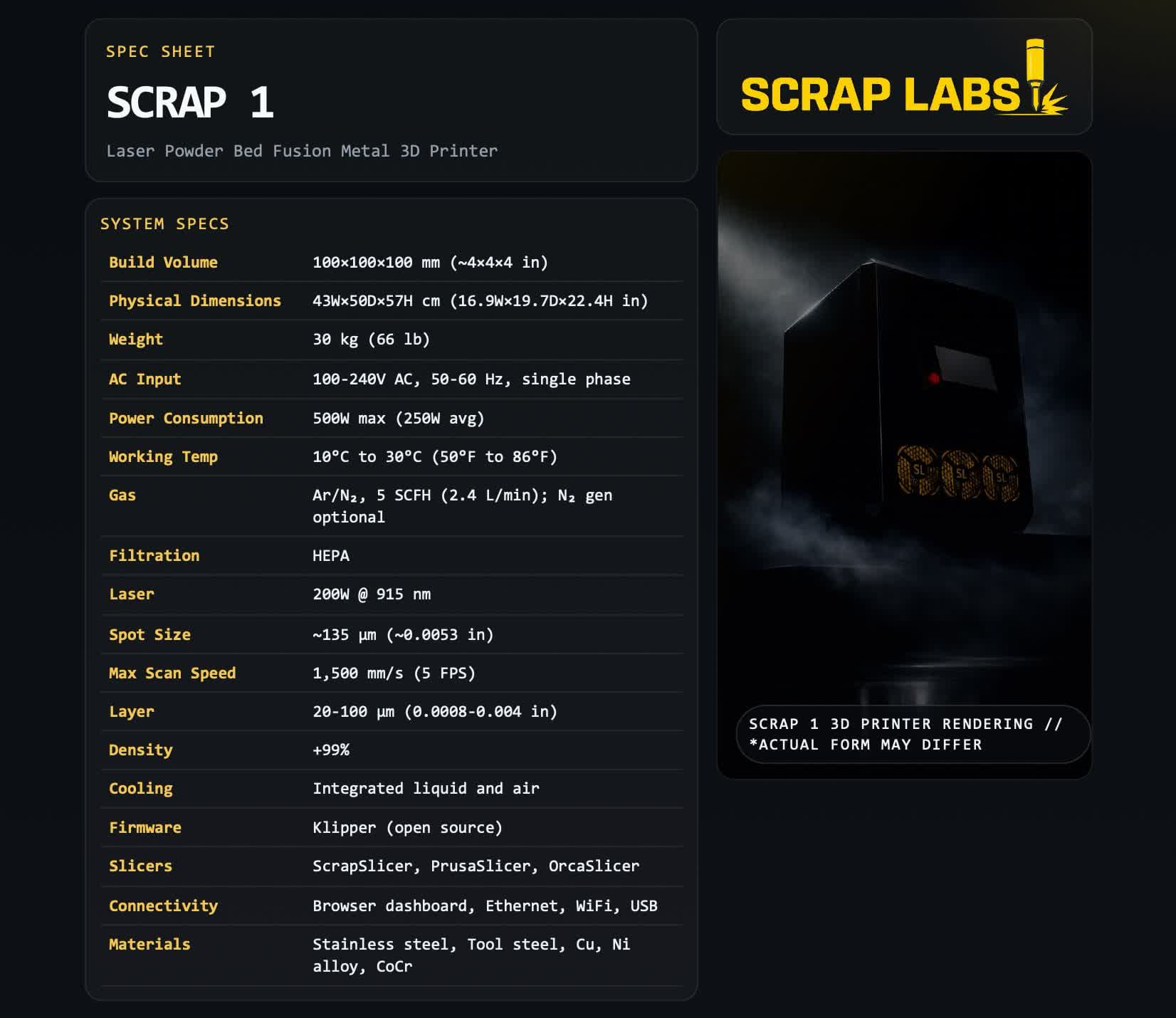 在设计理念上,Scrap 1 试图在不改变核心工艺的前提下,尽量降低使用门槛。设备内部集成了液冷与风冷系统,并配备 HEPA 过滤以控制颗粒物排放,在维持工艺稳定性的同时兼顾操作安全。平台支持多种金属材料,包括不锈钢、工具钢、铜、镍基合金以及钴铬合金,目标覆盖从功能原型到小批量生产等多种应用场景。